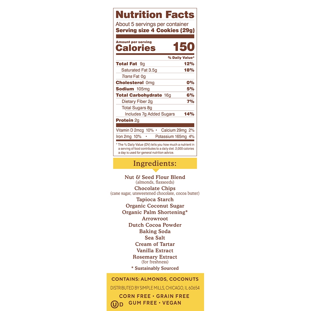 SIMPLE INGREDIENTS: Nut and Seed Flour Blend (almonds, flax seeds), Chocolate Chips (cane sugar, unsweetened chocolate, cocoa butter), Tapioca Starch, Organic Coconut Sugar, Organic Palm Shortening, Arrowroot, Cocoa powder, Baking Soda, Sea Salt, Cream of Tartar, Vanilla Extract, Rosemary Extract (for freshness),